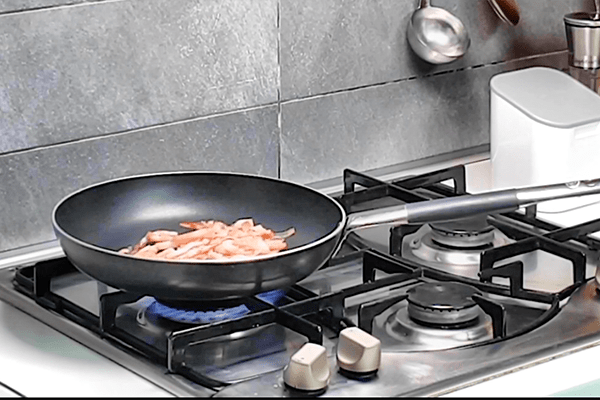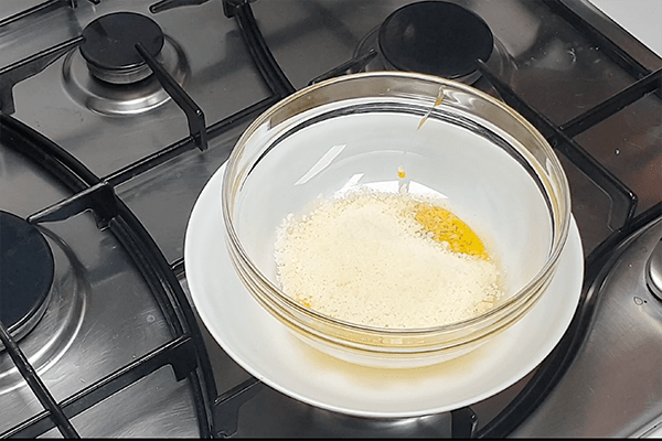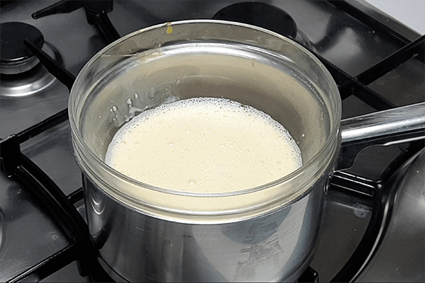 Per la crema carbonara scaldare in bagnomaria fino a sfiorare il bollore 60 ml di latte e 60 di panna