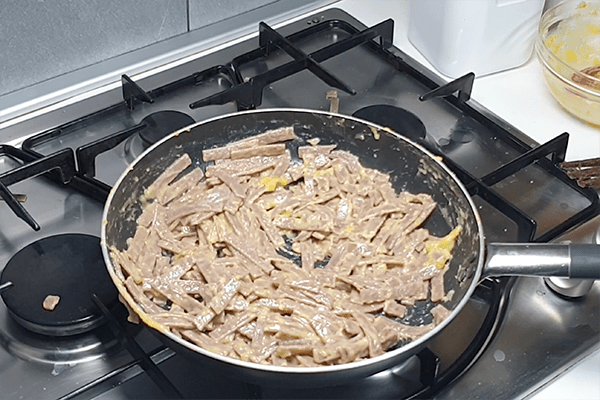 Riscaldare la padella con il grasso di guanciale ed ultimate la cottura dei pizzoccheri in quest’ultima, aggiungendo poca acqua di cottura. Infine fuori dal fuco unite il pastello carbonaro