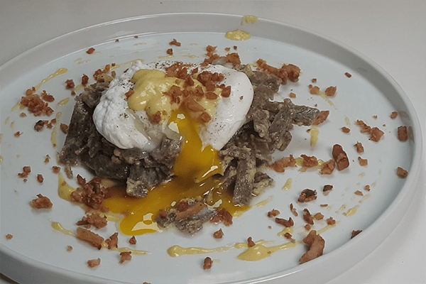 Colate della crema inglese su pizzoccheri, adagiate l’uovo pochette e ancora crema inglese. Ultimate con il guanciale croccante.